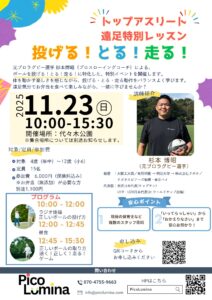 元プロラグビー選手 杉本博昭(プロスローイングコーチ)による、ボールを投げる!とる!走る!に特化した、特別イベントを開催します。体を動かす楽しさを感じながら、投げる・とる・走る動作をバランスよく学びます。遠足気分でお弁当 […]